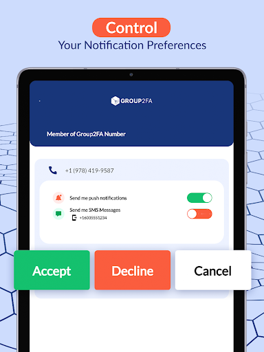 Setting up shared accounts and group verification sharing on Group2FA is easy! Just make an acc using your phone number to be the Group2FA admin. Once you sign up, the admin with the Group2FA subscriber/admin status can share the Group2FA number with their chosen trusted users. Shared acc users can obtain verification codes or 1 time passcode (OTP) to sign in to the accounts they need to – that’s it! Obtain SMS text messages, in-app and push notifications whenever someone requests access!